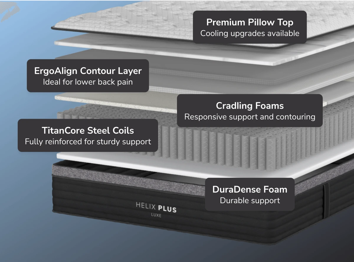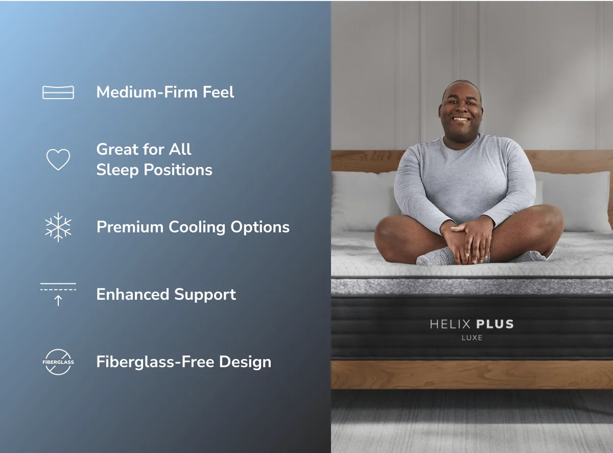 Optimal For All Sleep PositionsThe Helix Plus Luxe combines our Helix Dynamic Foam with a durable responsive foam that contours at your helps and shoulders while maintaining spinal alignment in all sleeping positions.