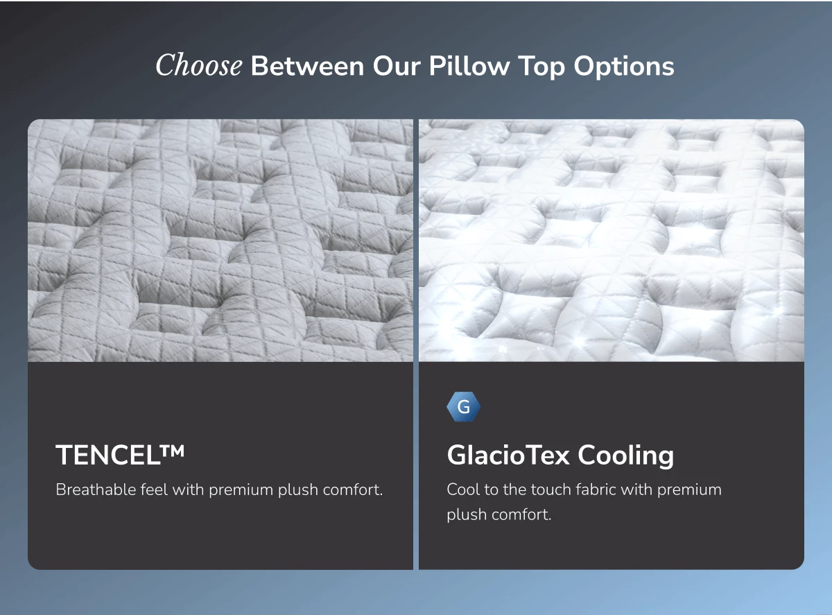 A Choice Between Cooling CoversSelect either an ultra breathable TENCEL™ cover, designed for maximum airflow, or upgrade to our GlacioTex™ Cooling Cover, which effectively pulls heat away from your body for your most comfortable sleep, ever.