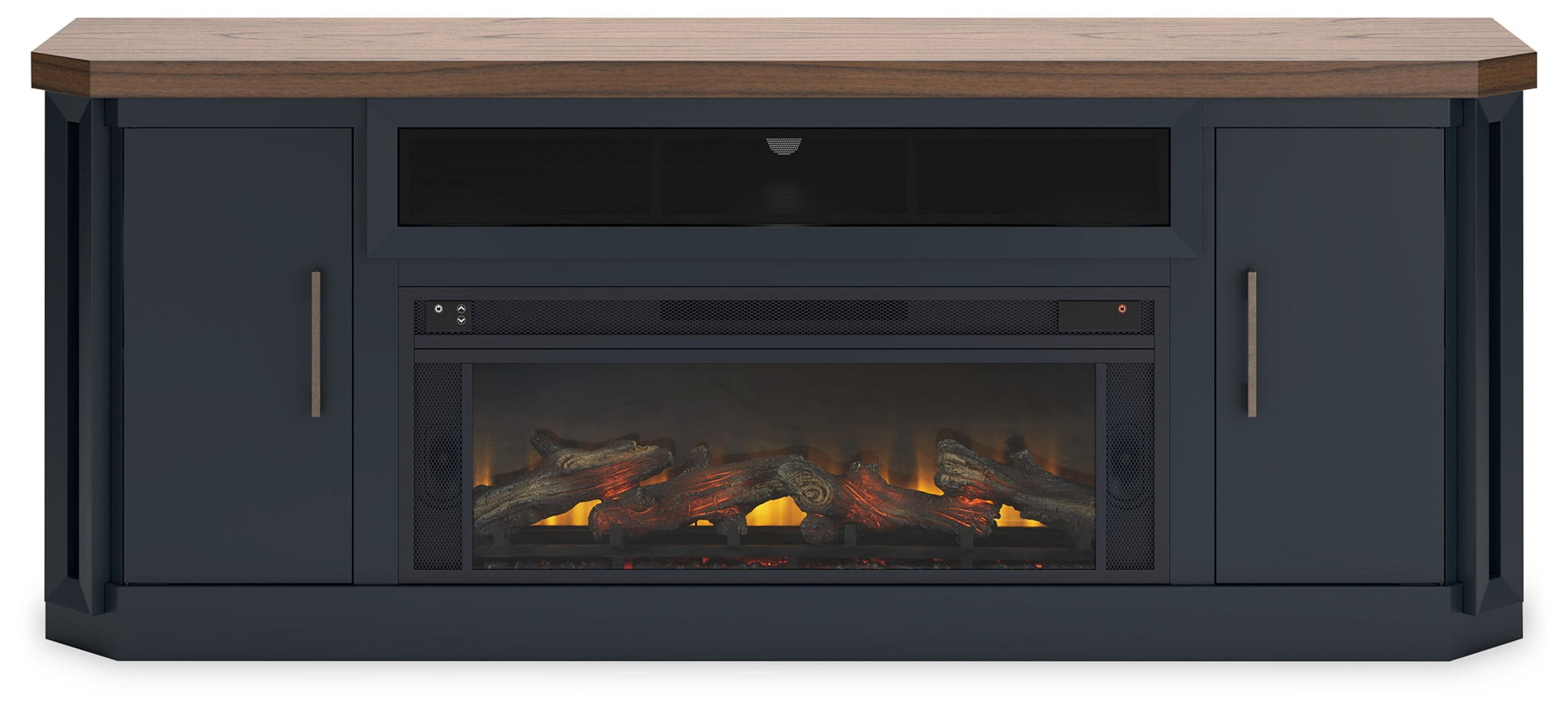 This TV stand combines casual contemporary design with modern appeal. Its combination of a thick-bodied wood-tone top with a slate blue cabinet is a smart choice on so many levels. Stow away electronics in the roomy cabinets, and use the upper shelf to conceal a soundbar speaker for a clean, integrated look. Adding a touch of romance to the scene, the fireplace insert brings warmth and beautiful ambiance to your living room. With the touch of a button, adjust the temperature and the flame brightness, and connect your device to the built-in wireless speakers. The flame effect includes a realistic-looking log set with glowing embers, along with an ambient down light.