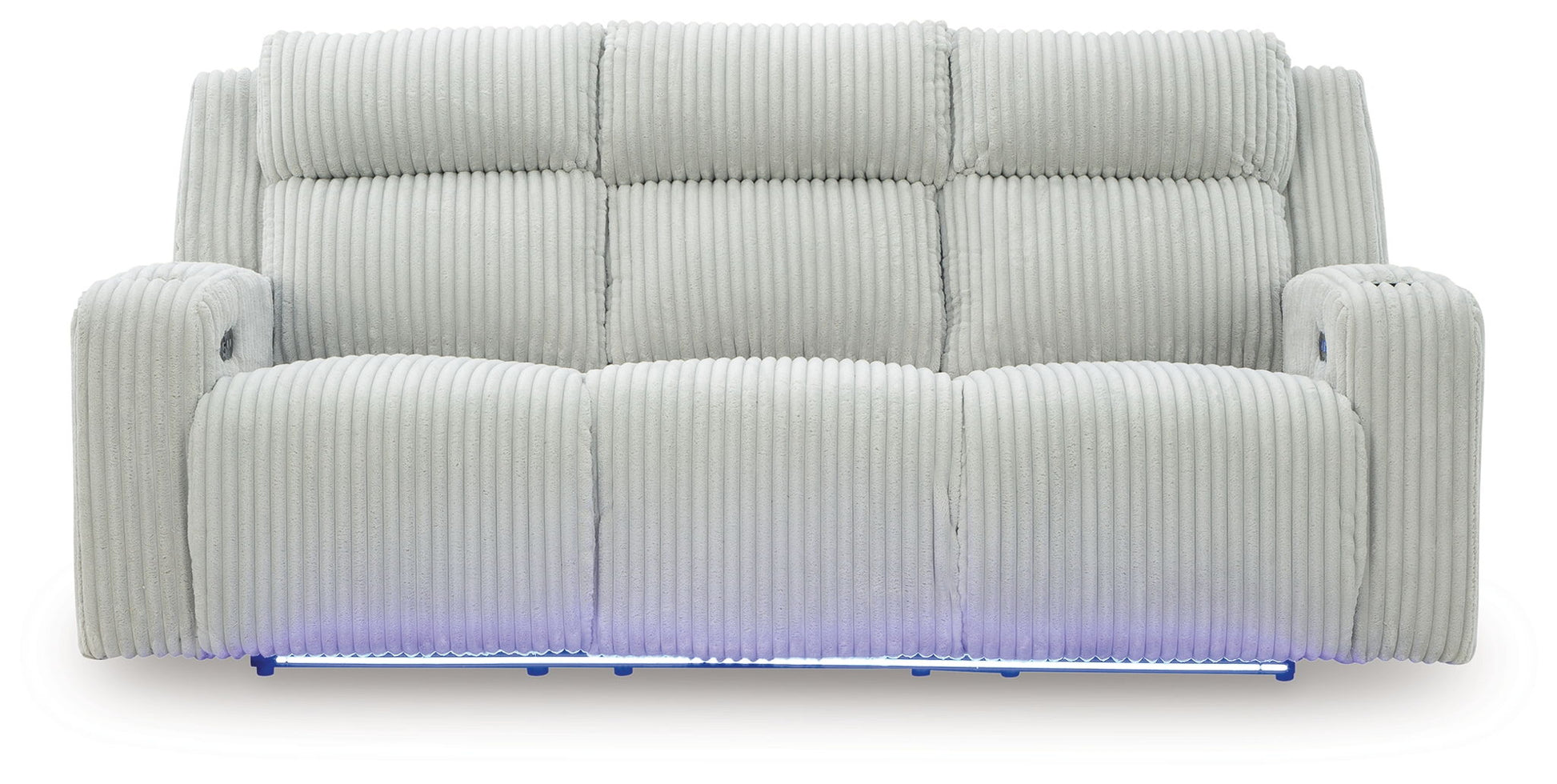 Trend-right style, meet irresistible modern function. Your living room gets a cozy-cool upgrade with the TwinBrooke power reclining seating package. Curl up in its ultra-chic corded upholstery and recline with one-touch controls. Is it movie night or game time? With ambient LED lighting, this set transforms from a serene relaxation spot to an entertainment hub. USB charging, cup holders and storage cutouts make lounging all the more convenient.
